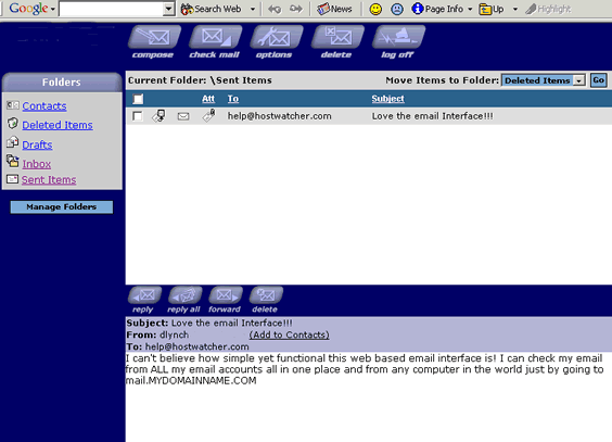 The EMAIL CONTROL PANEL has many options to customize the appearance and display of emails. You can create additional folders to allow on-server storage of mail. |